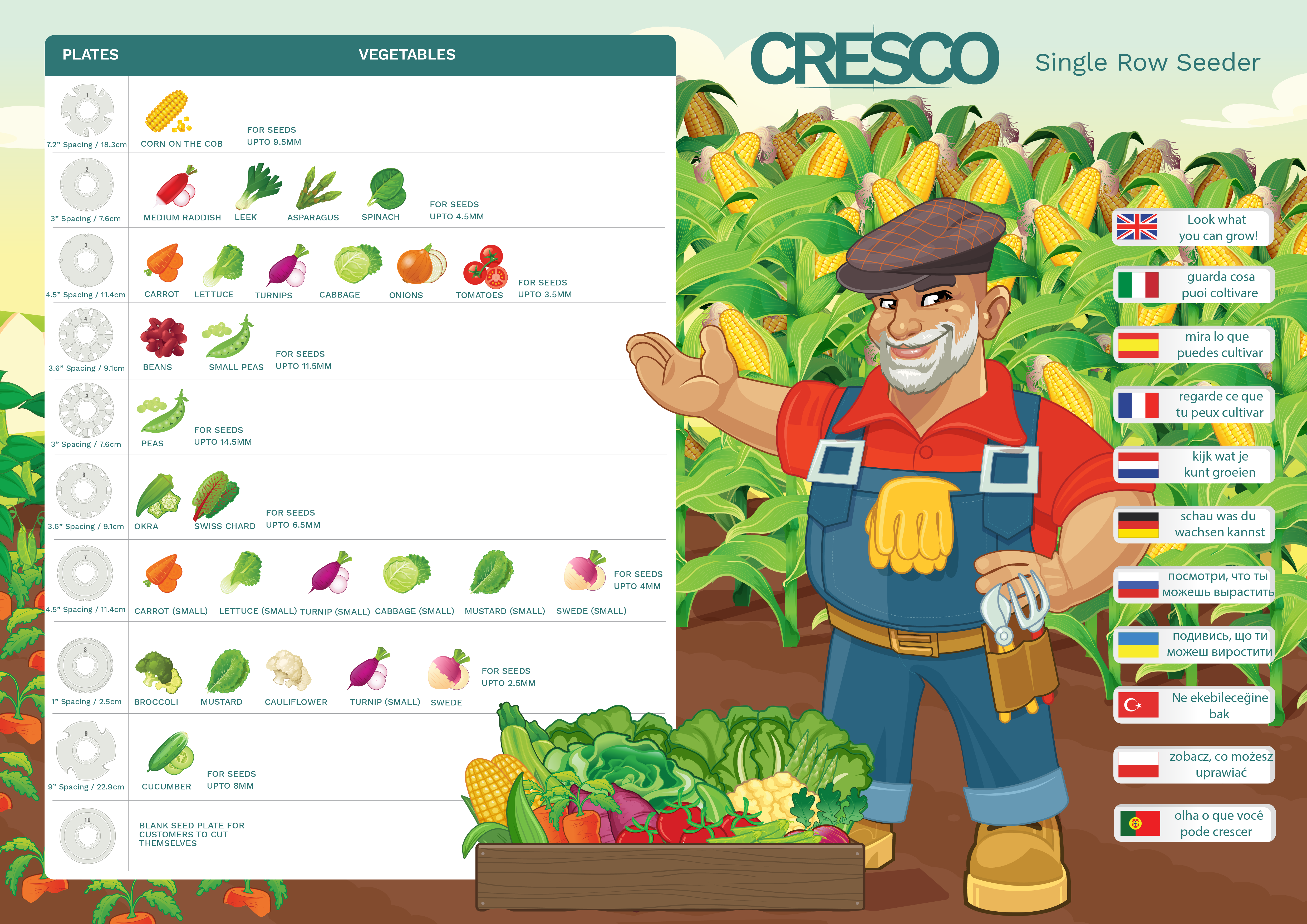 Das Paket enthält auch zehn Arten von Aussaatzielen für die Aussaat verschiedener Arten von Saatgut. Geeignet zum Beispiel für die Aussaat von Mais, Rettich oder Rüben, Lauch, Spinat, Salat, Bohnen oder Erbsen, Karotten, Rüben oder Mangold.