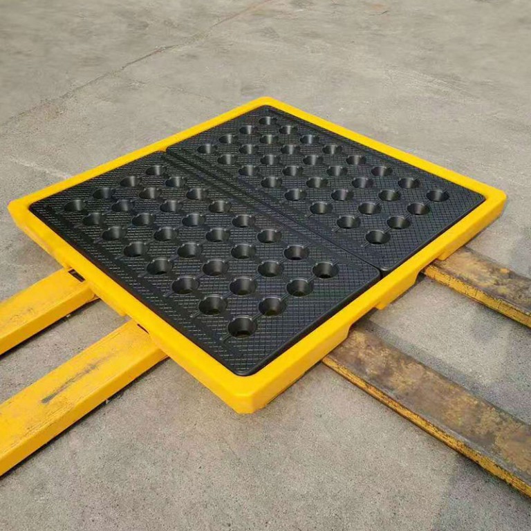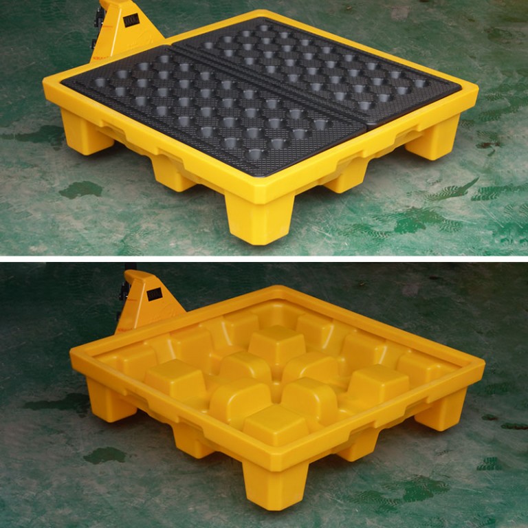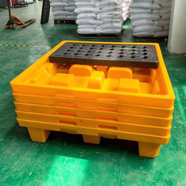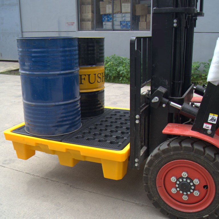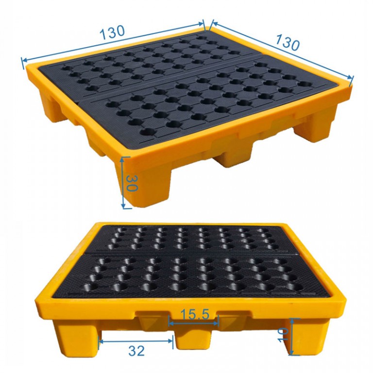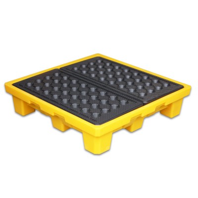 Kunststoff-Tropfschale / Kunststoffpalette mit Rost unter 4 Fässern.